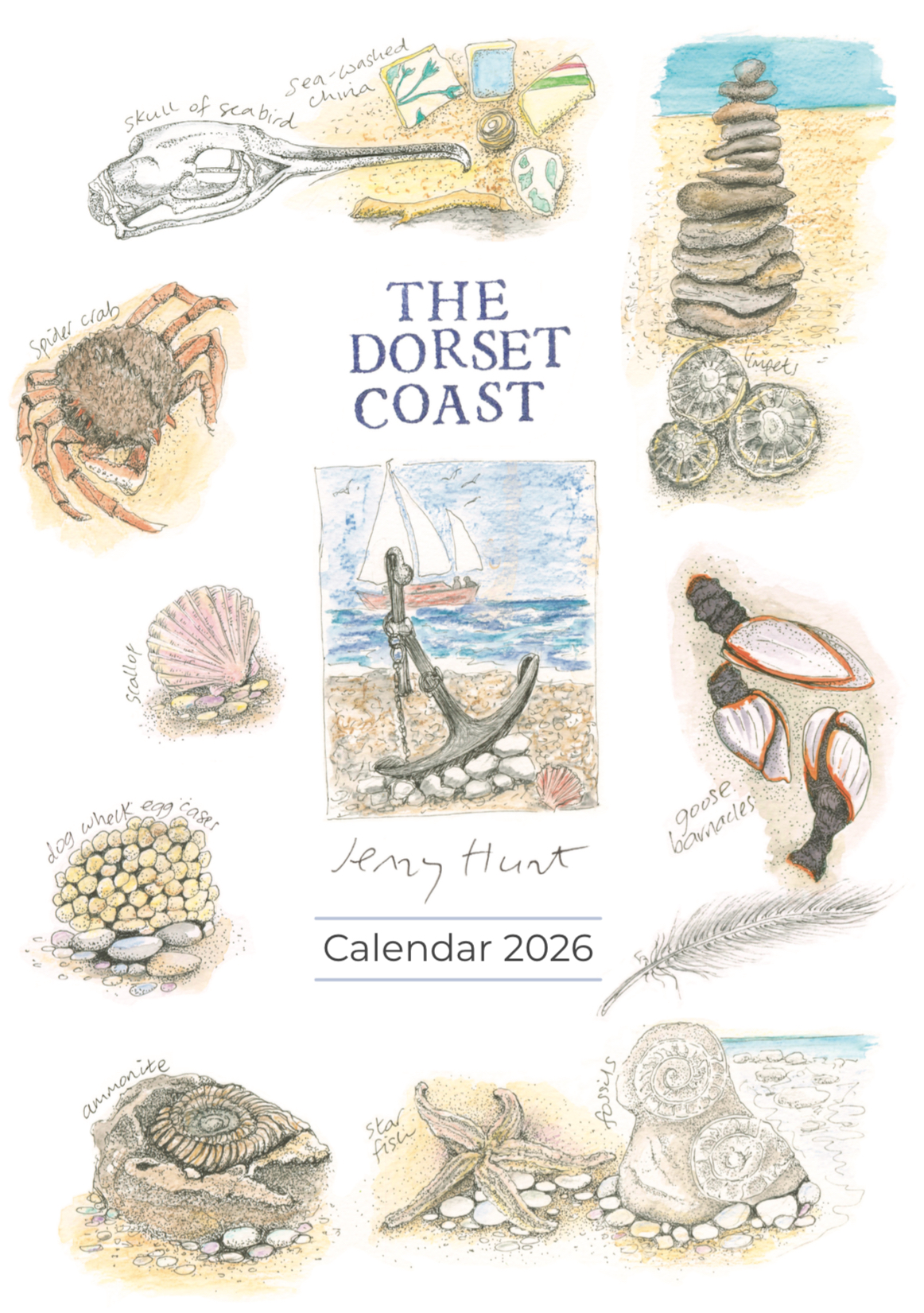 A4 Calendar 2026 – ‘The Dorset Coast’ Sketches along the Dorset Coast by Jenny Hunt. Each month has a different illustration featuring wildlife and a location along the Dorset Coast.