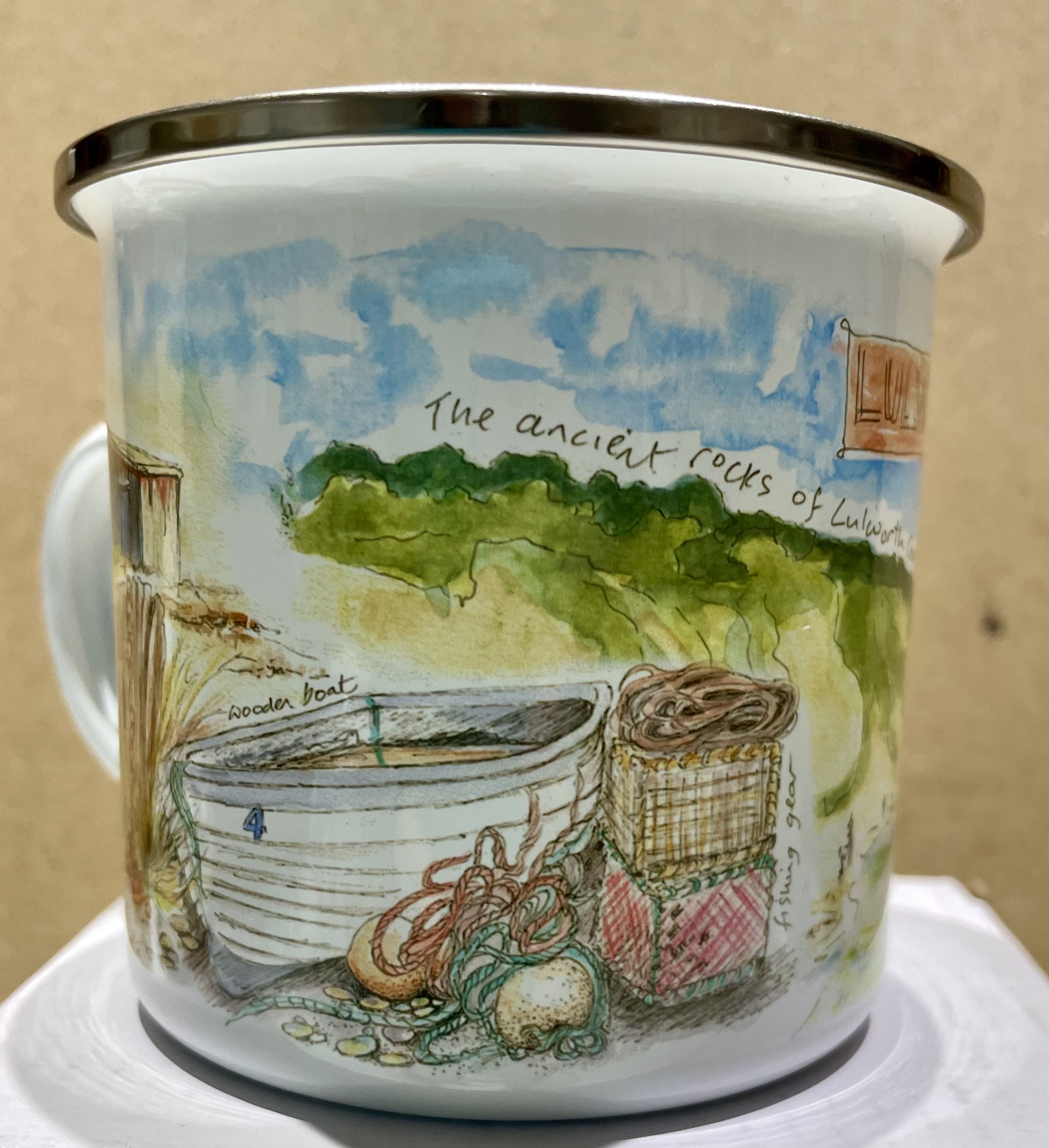 Limited edition enamel mug with printed illustration of Lulworth Cove by Jenny Hunt